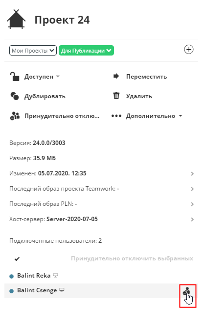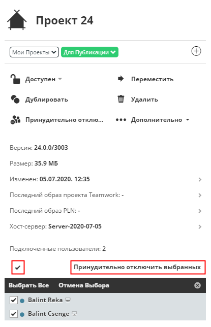 Щелкните на этой команде для принудительного отключения пользователей от проектов.