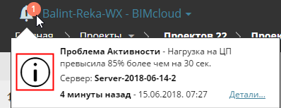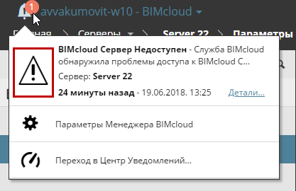 Уведомления действуют в зависимости от конкретных ситуаций и позволяют быстро открыть соответствующую страницу BIMcloud Manager, на которой можно увидеть и/или устранить возникшую проблему.