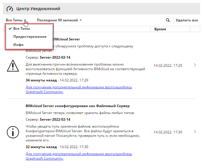 Центр Уведомлений содержит список всех актуальных Уведомлений BIMcloud. Чтобы открыть Центр Уведомлений, выполните одно из следующих действий: