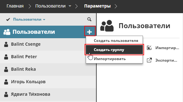 Нажмите кнопку с символом "плюс" и выберите из выпадающего списка команду Создать группу. (Если выбрана корневая папка Пользователей, то эта команда также присутствует в Сводной Панели.)