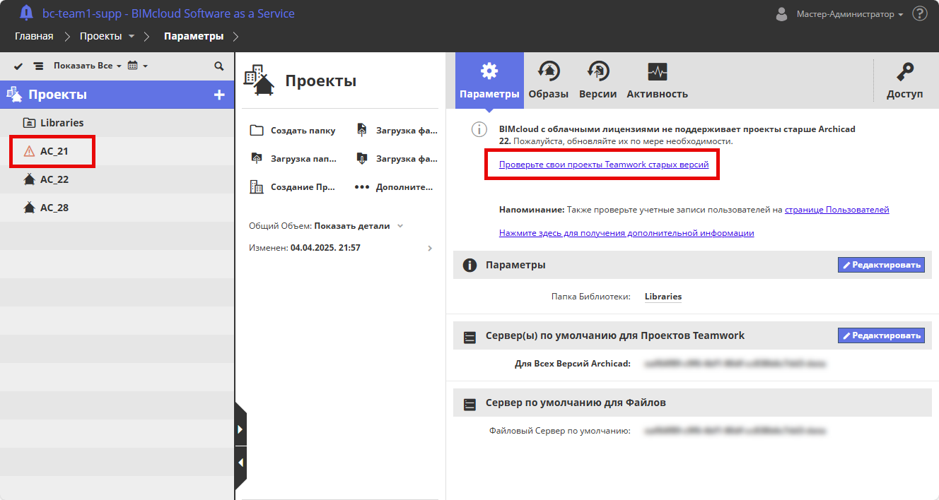 В BIMcloud Manager проверьте страницу Проектов: все старые проекты Teamwork помечаются красным значком.