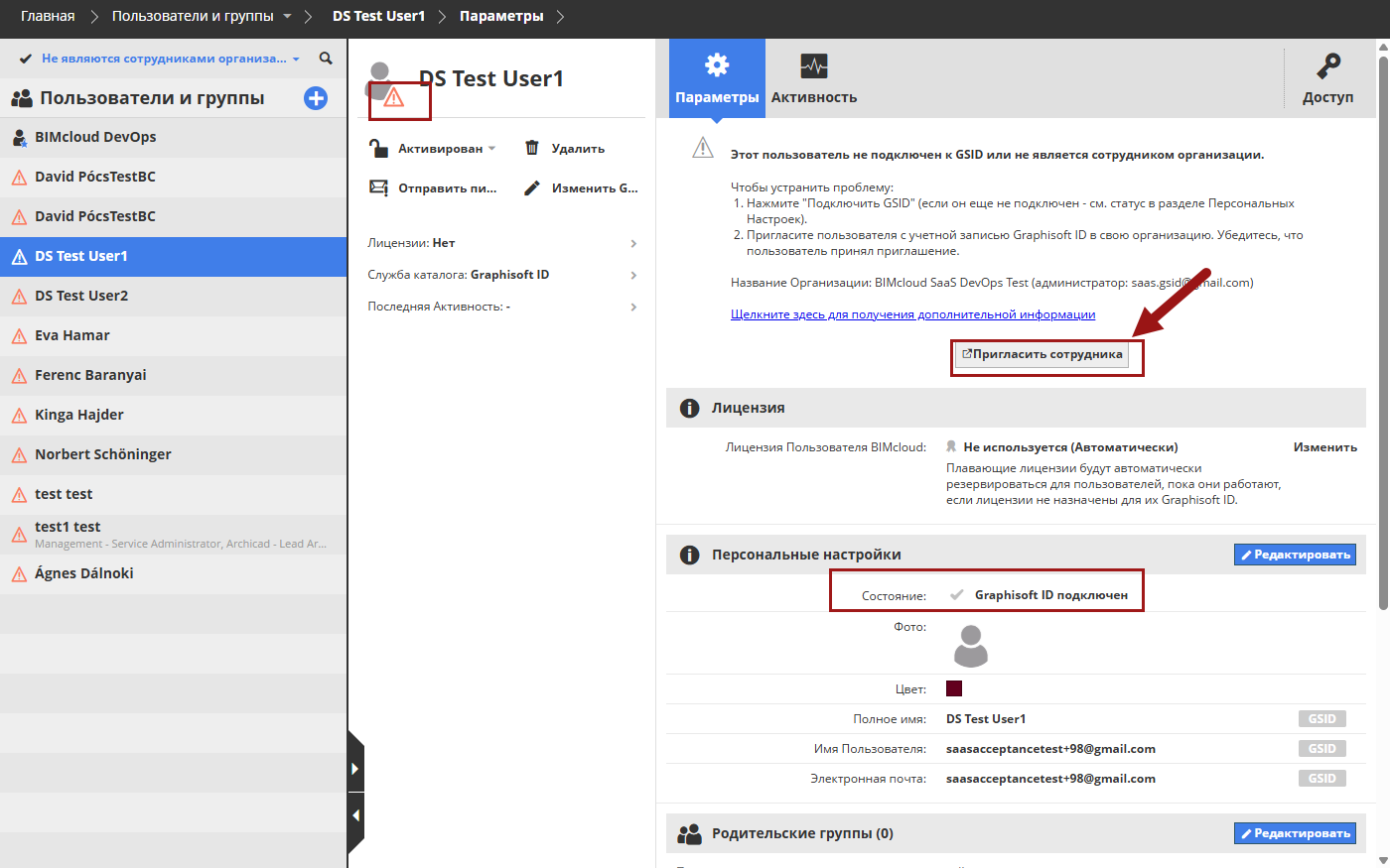 Все пользователи BIMcloud должны быть приглашены в учетную запись вашей Организации. Для пользователей, которые еще не являются сотрудниками вашей Организации: воспользуйтесь командой "Пригласить сотрудника", чтобы открыть свою учетную запись Graphisoft ID Организации и отправить приглашения.