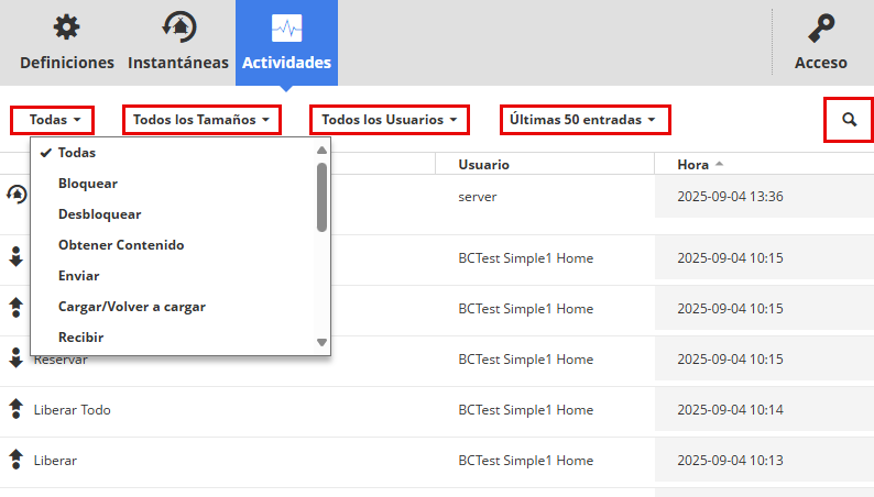 Rango: Limitar la lista de actividades mostradas. Puede listar los últimos 50 eventos, o eventos de un rango específico de fecha/hora. (Intervalo máximo de fechas: los últimos 30 días)