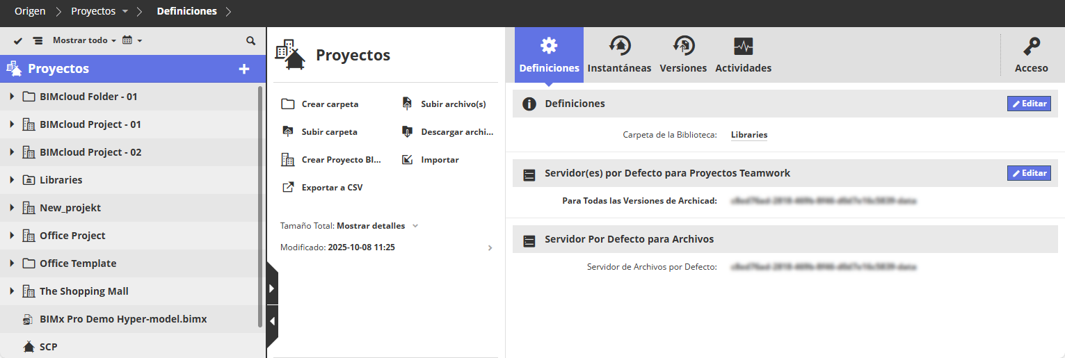 Proyectos BIMcloud ("Contenedores" creados por usted en BIMcloud para agrupar archivos relacionados, y asociados a un equipo de usuarios