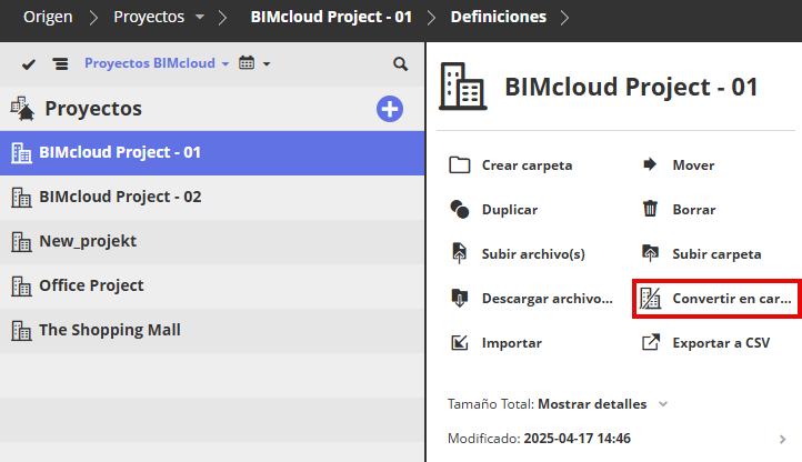 Convertir un Proyecto BIMcloud en una carpeta significa que se perderán sus definiciones de Equipos y de acceso relacionadas. (Los Equipos solo son relevantes para los Proyectos de BIMcloud; no tienen significado para las carpetas normales u otros elementos en BIMcloud).