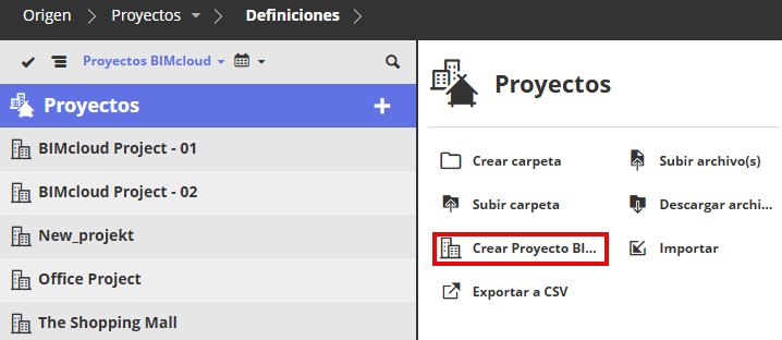 Desde la raíz de Proyectos o cualquier carpeta en el árbol de Proyectos: haga clic en Crear Proyecto BIMcloud.
