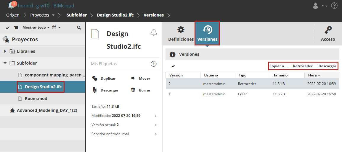 Guardar y recuperar versiones anteriores de archivos en BIMcloud