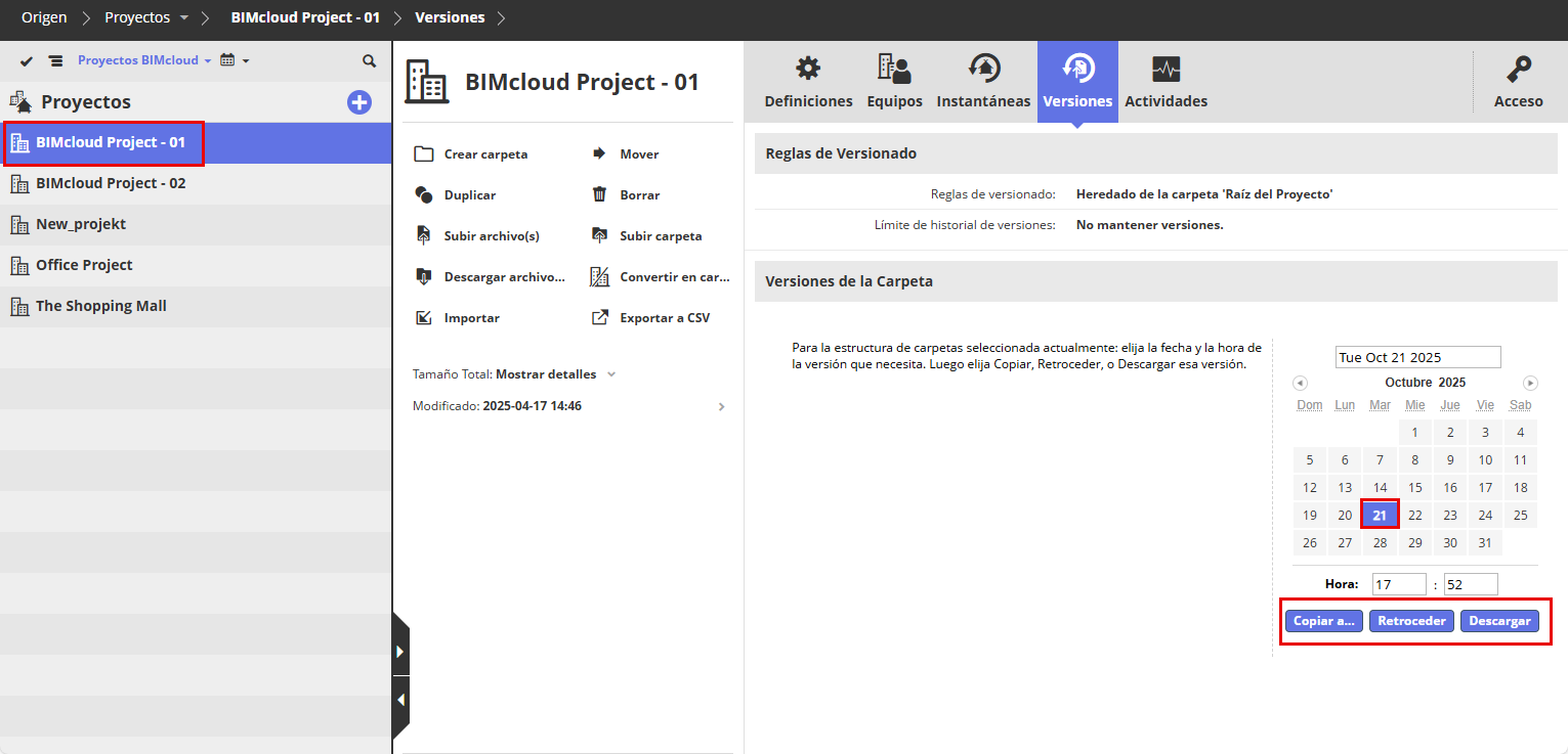 Nota: La carpeta copiada contendrá solo la última versión de cada archivo subido.Retroceder: Los archivos de esta carpeta retrocederán a la fecha seleccionada.