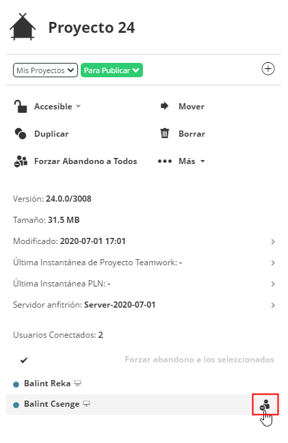 Nota: Forzar el Abandono de un usuario es inmediato; el usuario no podrá enviar sus cambios. Un usuario forzado al abandono puede reconectarse al proyecto inmediatamente sin ninguna restricción. Si desea evitar que el usuario se reconecte al proyecto, anule sus permisos en el panel de acceso al proyecto.