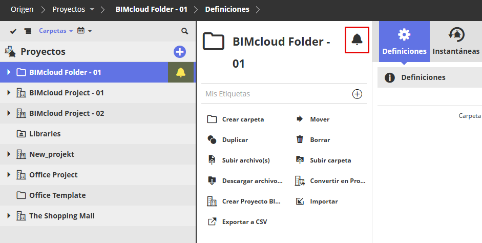 Realice un seguimiento de los cambios realizados en los archivos y carpetas en BIMcloud suscribiéndose a estos elementos en la página Proyectos de BIMcloud Manager. La "carpeta" puede ser una carpeta normal, un proyecto BIMcloud o una carpeta de Biblioteca.