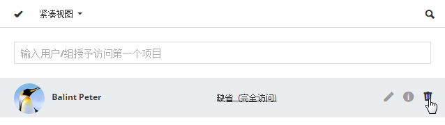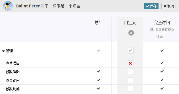 選定用戶的權限設定視圖將立刻開啟: 請雙擊複選框,然後出現紅色X,即可撤消任意權限。