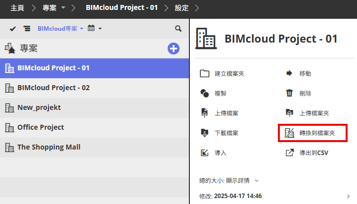 將BIMcloud專案轉換為檔案夾意味著其團隊和相關訪問定義將缺失。(團隊僅與BIMcloud專案相關—它們對BIMcloud上的常規檔案夾或其他專案沒有意義)。