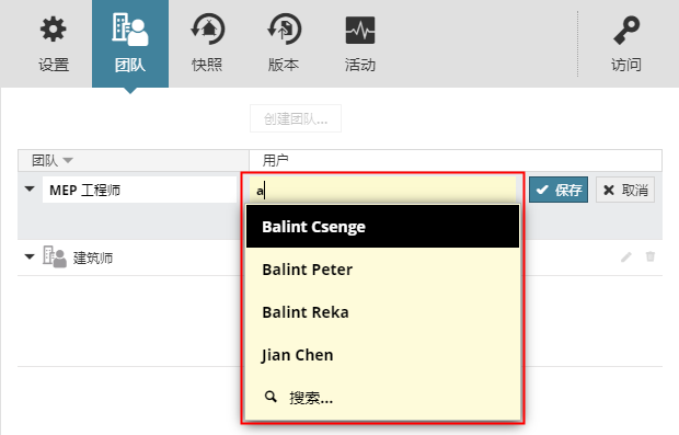 建立或添加到 BIMcloud 專案團隊 為BIMcloud 專案設定一個團隊 從BIMcloud管理器的“專案”頁面中,選擇一個BIMcloud專案。 轉到“團隊”面板,然後點擊建立團隊 輸入團隊名稱(例如“MEP工程師”),然後點擊建立 點擊出現的“用戶”字段,然後輸入用戶名,或點擊搜索調出可搜索的用戶列表。點擊添加所需的名稱。 點擊儲存。 上層主題: BIMcloud專案團隊 相關資訊 BIMcloud專案和團隊的權限