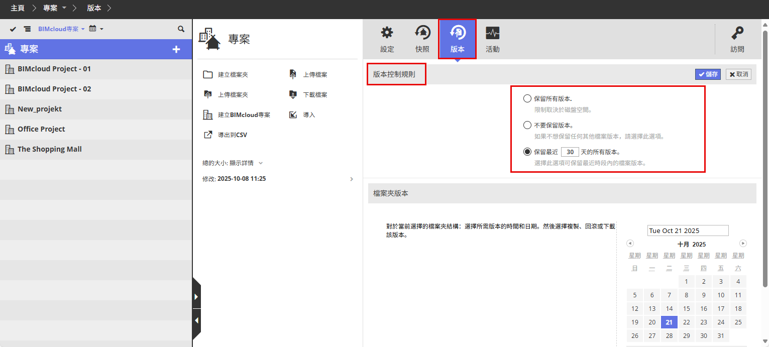 如果要檢索或回滾以前的狀態,這些舊版本可能很有用。然而,存儲舊版本會佔用空間。使用BIMcloud的版本管理規則來決定是否存儲檔案版本以及存儲多長時間。