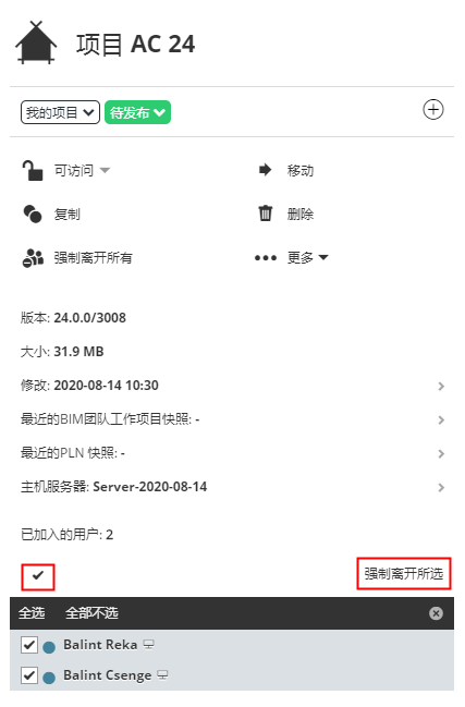 檢查您希望從專案中強制離開的用戶:“選擇強制離開”按鈕啟用。