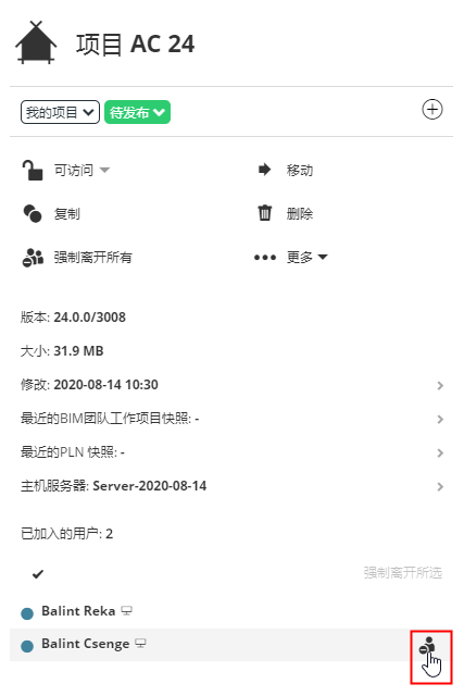 註: 強制用戶離開是立即執行的;用戶將無法發送他們的更改。一位被強制離開的用戶可以在沒有進一步限制條件下立刻重新加入該專案。如果您想阻止用戶重新加入該專案,可以在專案的訪問面板中撤銷他們的權限。