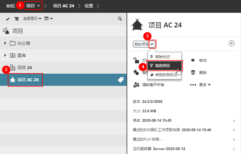 在 BIMcloud 管理器中使用標記來濾鏡並找到專案