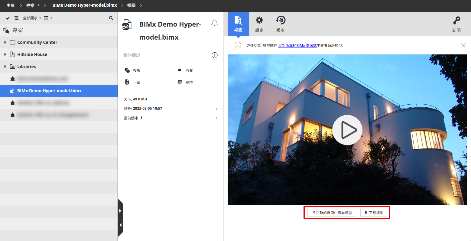 註: 可能有BIMx桌面瀏覽器的更新版本可用,但尚未內置於BIMcloud中。其他相關功能,請在BIMx Desktop的最新版本中查看此超級模型。