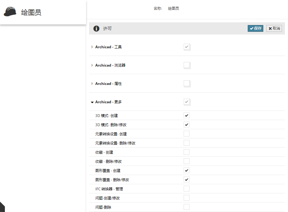 角色權限分為六組與 Archicad 相對的權限,外加一組管理權限。在每個類別中點擊類別頁眉使列表擴大/最小化。