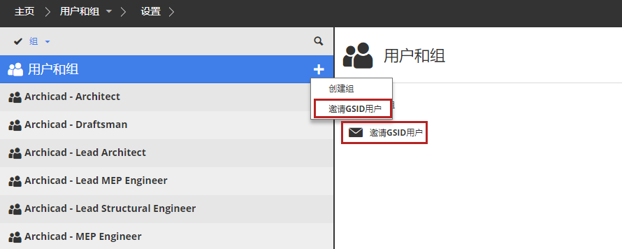 從“摘要”面板或加號圖標(專案瀏覽器)點擊邀請 GSID 用戶。