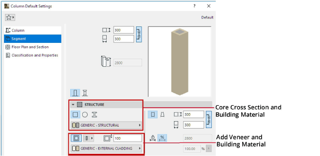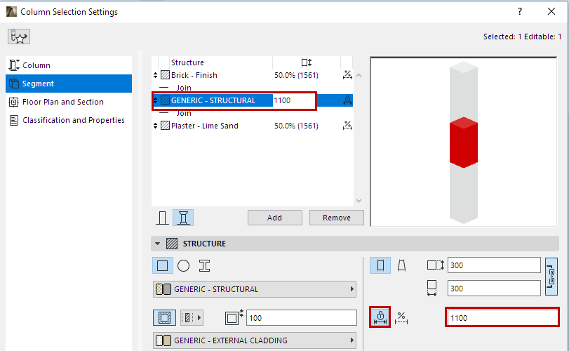 –For fixed-length segment: Define length. This length will remain unchanged even if the Column stretches. (You can also enter a selected segment’s length in the Structure list.)