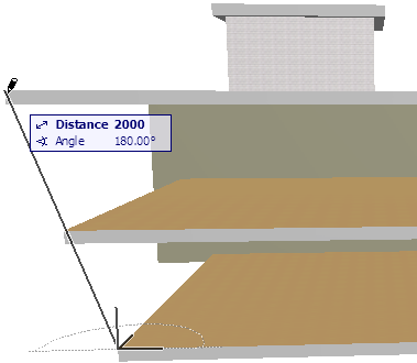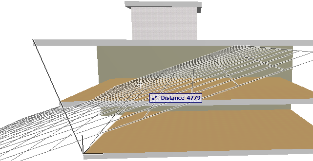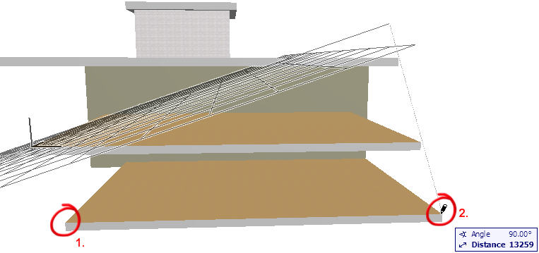 5.Now you are ready to draw the input line. The input line (as indicated by the rubber band line) is constrained and is projected perpendicularly to the input plane. Click at the two points where you want the Curtain Wall to begin and end: in our case, at the two front corners of any of the slabs.