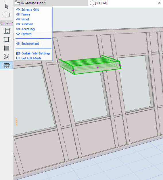 1.Enter Curtain Wall Edit mode in the 3D window.