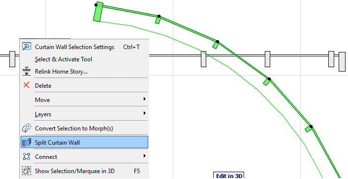 2.Use Design > Modify Curtain Wall > Split Curtain Wall, or the same command from the context menu.