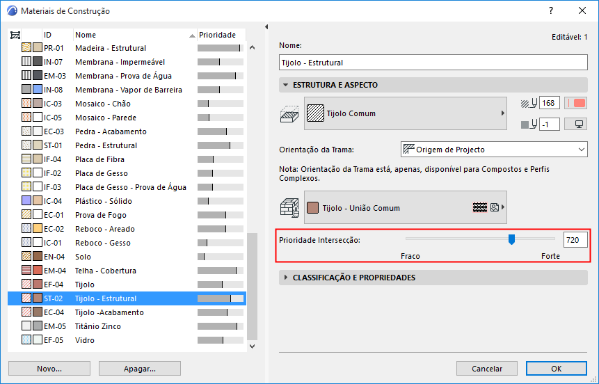•Use the slider at right to adjust this Building Material’s relative priority in its intersections with other construction elements. (Expressed in numbers, an intersection priority can run from weak - a minimum of 0 - to strong - maximum of 999. This will affect the element’s intersections and display in model views.