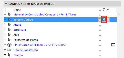In this example: the Volume field has activated the up arrow. The listed walls that are of the same structure type will be listed in order of their volume (top value the highest).