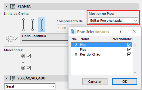 In the two fields to the right, enter the height level of each Grid line marker as displayed in Sections, and choose a reference level (default: Project Zero) for measuring this height level.