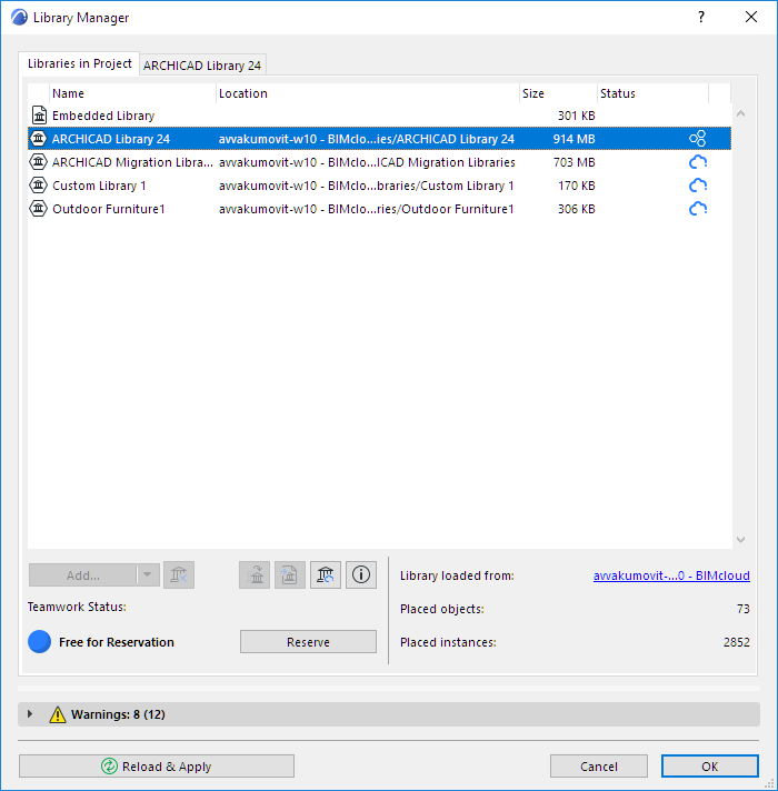 A Teamwork Project uses two types of libraries: the Embedded Library plus the BIMcloud Libraries. Just like in any Archicad project, these libraries are listed in the Library Manager.