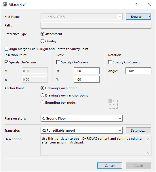 5.Choose a DWG/DXF Translator which will determine conversion options for the attached file (or just use the default translator shown). Click Settings to view the options for the current translator.