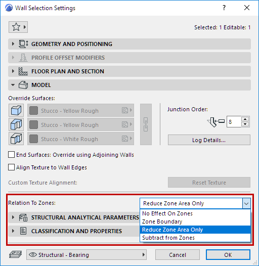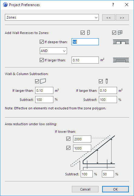 •If larger than: Enter the minimum area of Walls, Curtain Walls and/or Columns whose areas should be subtracted when calculating the size of Zones containing them. (Any elements smaller than this minimum limit will be included in the zone size.)