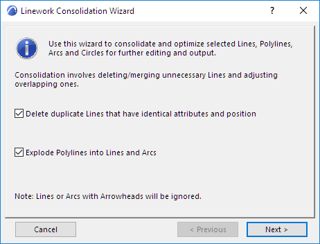 To access this dialog box, you must first select at least two line-type elements. Use Edit > Reshape > Linework Consolidation... command.