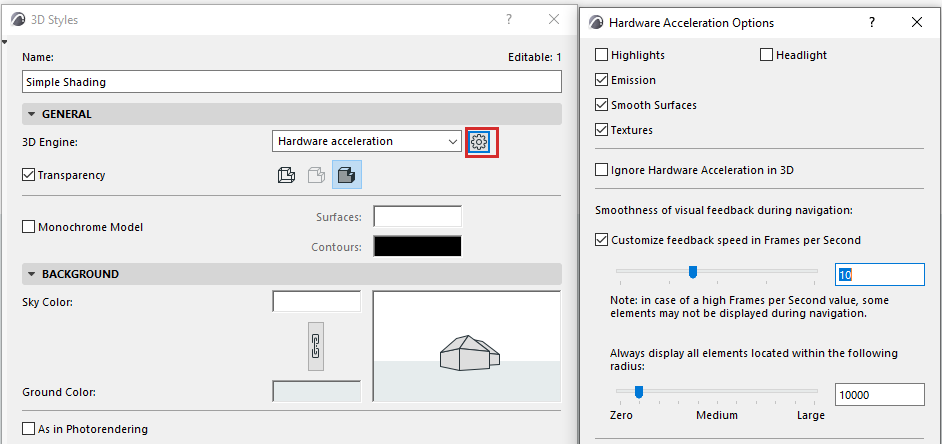 This dialog box is available from the Settings button in 3D Styles if you have chosen Hardware acceleration as your 3D engine.