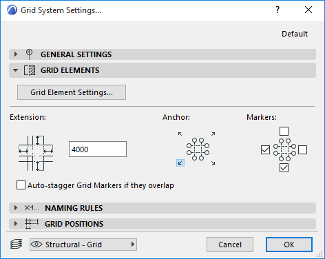 •Elements at Grid line intersections: Check this to place elements at grid line intersections. Click the pop-up to select the element type (Column or Object) and click the Settings button to open that element’s settings dialog on top of this dialog.