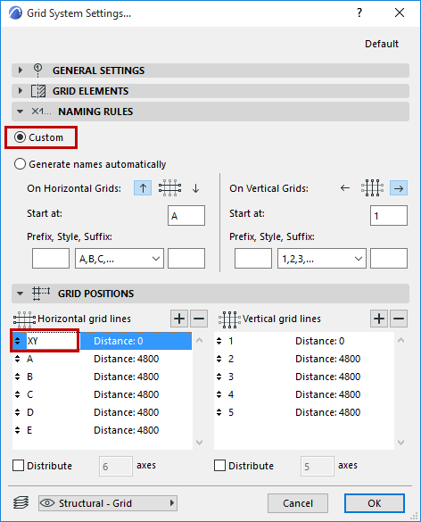 Custom: Select this to enter names manually for any grid element, using the fields in the Grid Positions Panel: if you click Custom in the Naming Rules Panel, then the Grid line names become editable in the Grid Positions Panel.