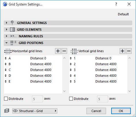Distribute: If you do not know the distance you will need between your Grid lines, check the Distribute box for either or both Grid line directions. This will enable you, when you place the Grid system, to set the beginning and endpoints of the Grid system in the given direction, divided into the number of Grid lines defined in the list.