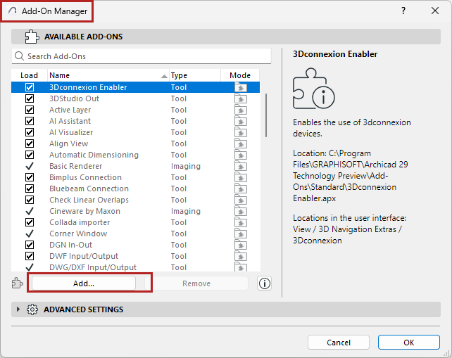 - In both versions of Archicad: use Add-On Manager to add the respective Project Compare add-on file