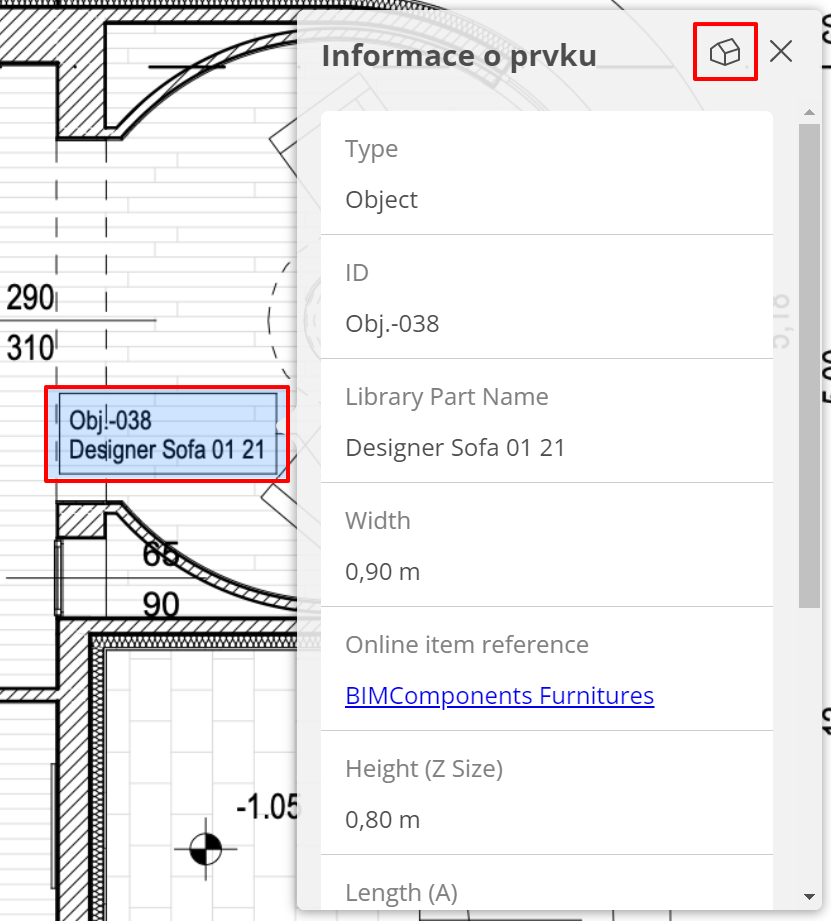 Kliknutím na ikonu otevřete 3D model a přiblížíte pohled na daný prvek.