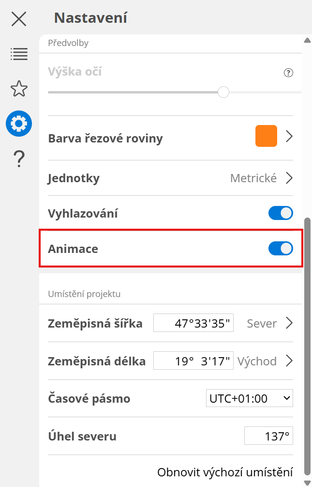 BIMx automaticky používá skutečnou polohu projektu na základě vašich údajů o poloze nastavených v Archicadu. Tyto informace o umístění se zobrazují v nastavení BIMx, ale můžete je také libovolně upravit.