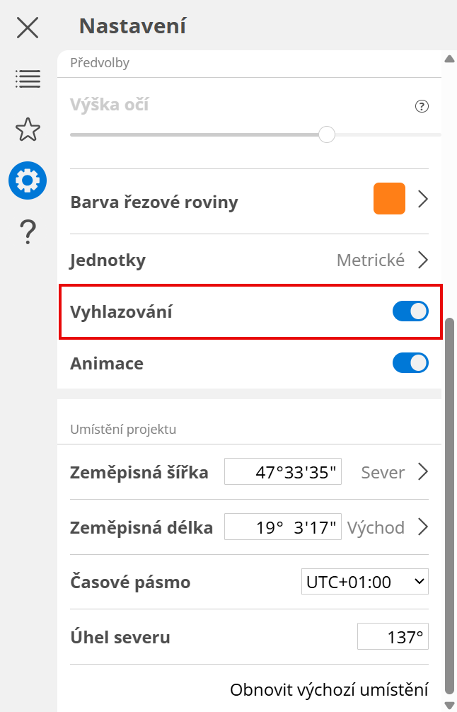 Vyhlazování může mít vliv na výkon. Pokud dochází ke zpomalení prohlížení, zkuste v nabídce Nastavení vyhlazování vypnout.