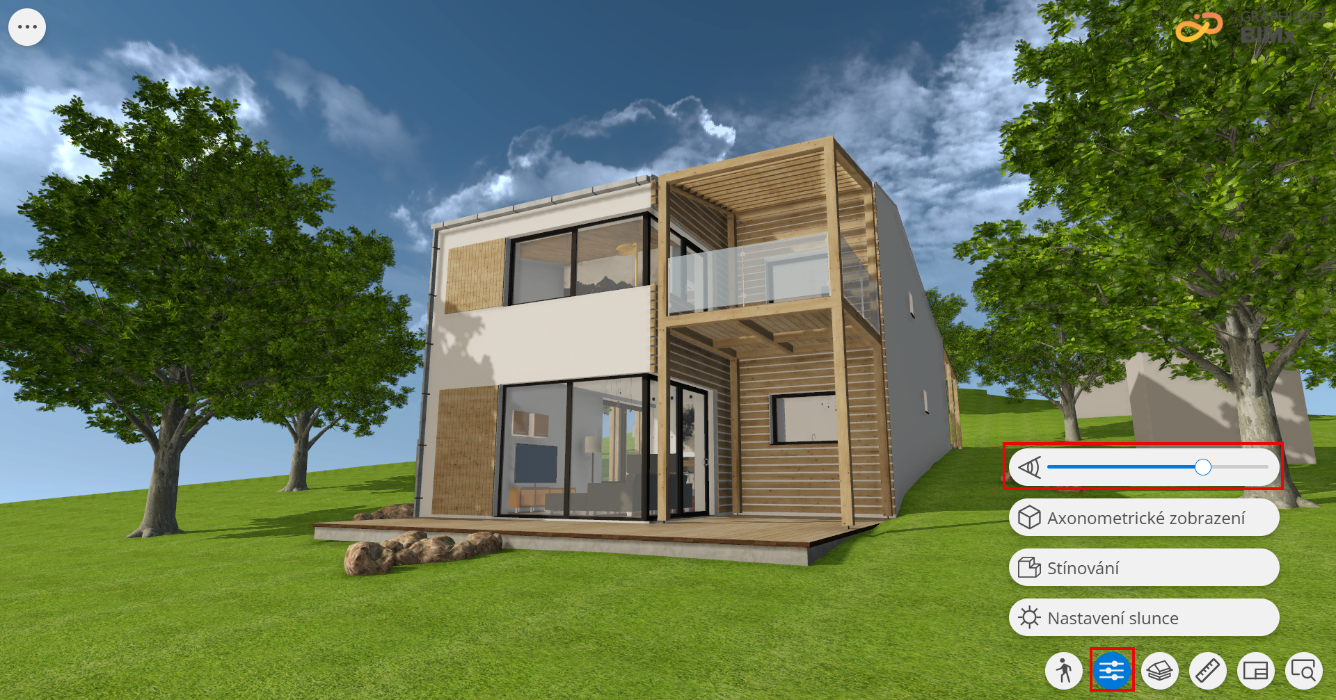 Tip: Dvojklikem nebo poklepáním na prvek se budova zobrazí v čelním pohledu. Takto snadno v axonometrii vytvoříte pohledy/řezy. Využijte je v kombinaci s rovinou řezu, různými nastaveními slunce a času a uložte si oblíbené pohledy.