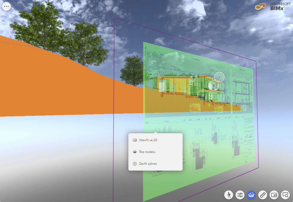 - Vytvořit řez pro vytvoření dočasné 3D roviny řezu Poznámka: Kliknutím na rámeček se vybere samotná rovina řezu (nikoli výkres). Kliknutím pravým tlačítkem myši otevřete kontextovou nabídku roviny řezu s příkazy Obrátit a Vypnout. Více informací o rovině řezu naleznete zde: 3D řez modelu (klávesová zkratka: C)
