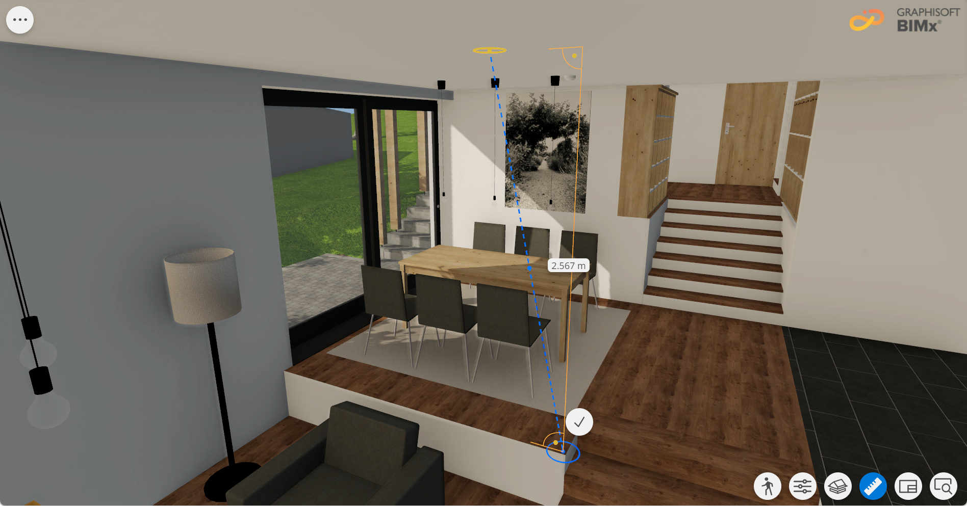 Otevřete libovolný 3D model, který máte ve svém BIMx hyper-modelu. Nástroj Měření funguje téměř stejně jako ve 2D, jen s následujícími rozdíly: