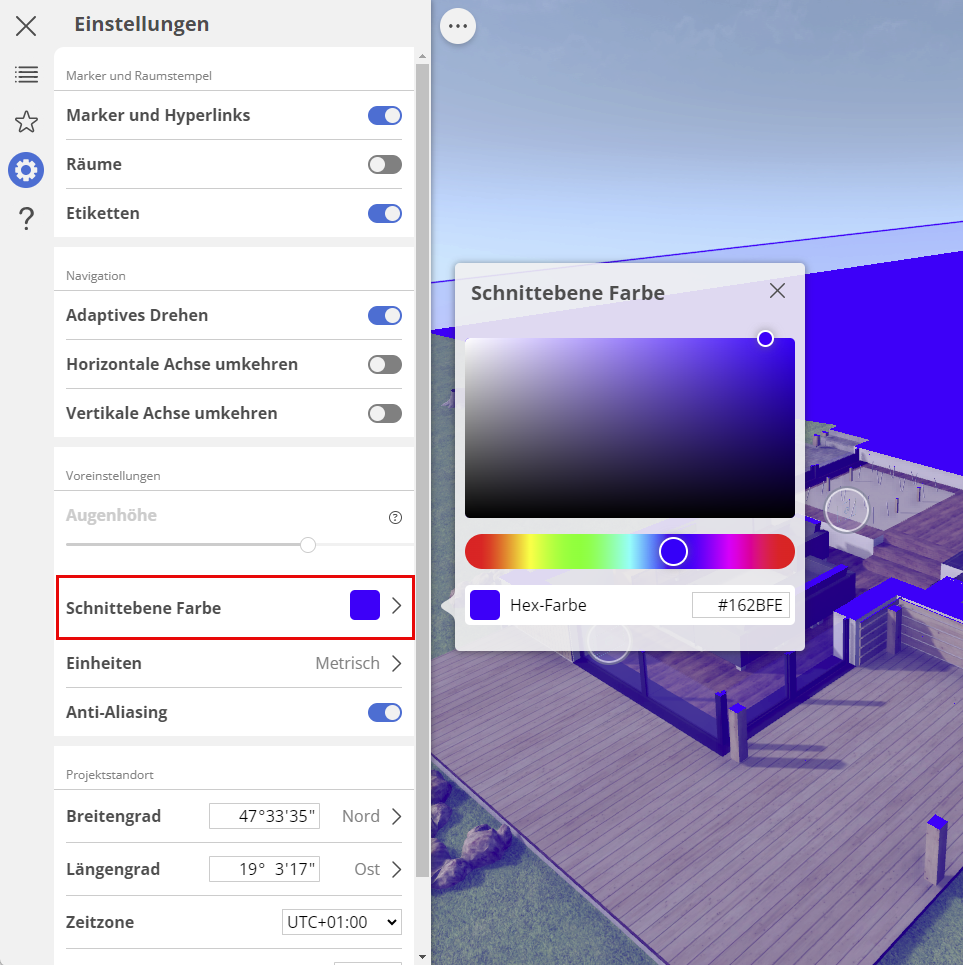 - Bewegen Sie den Mauszeiger über den Rahmen, um die Schnittebene anzuzeigen. Sie können die Farbe der Schnittebene mit der Schnittebenen-Farbauswahl in den BIMx-Einstellungen ändern. Siehe Schnittebenen-Farbauswahl