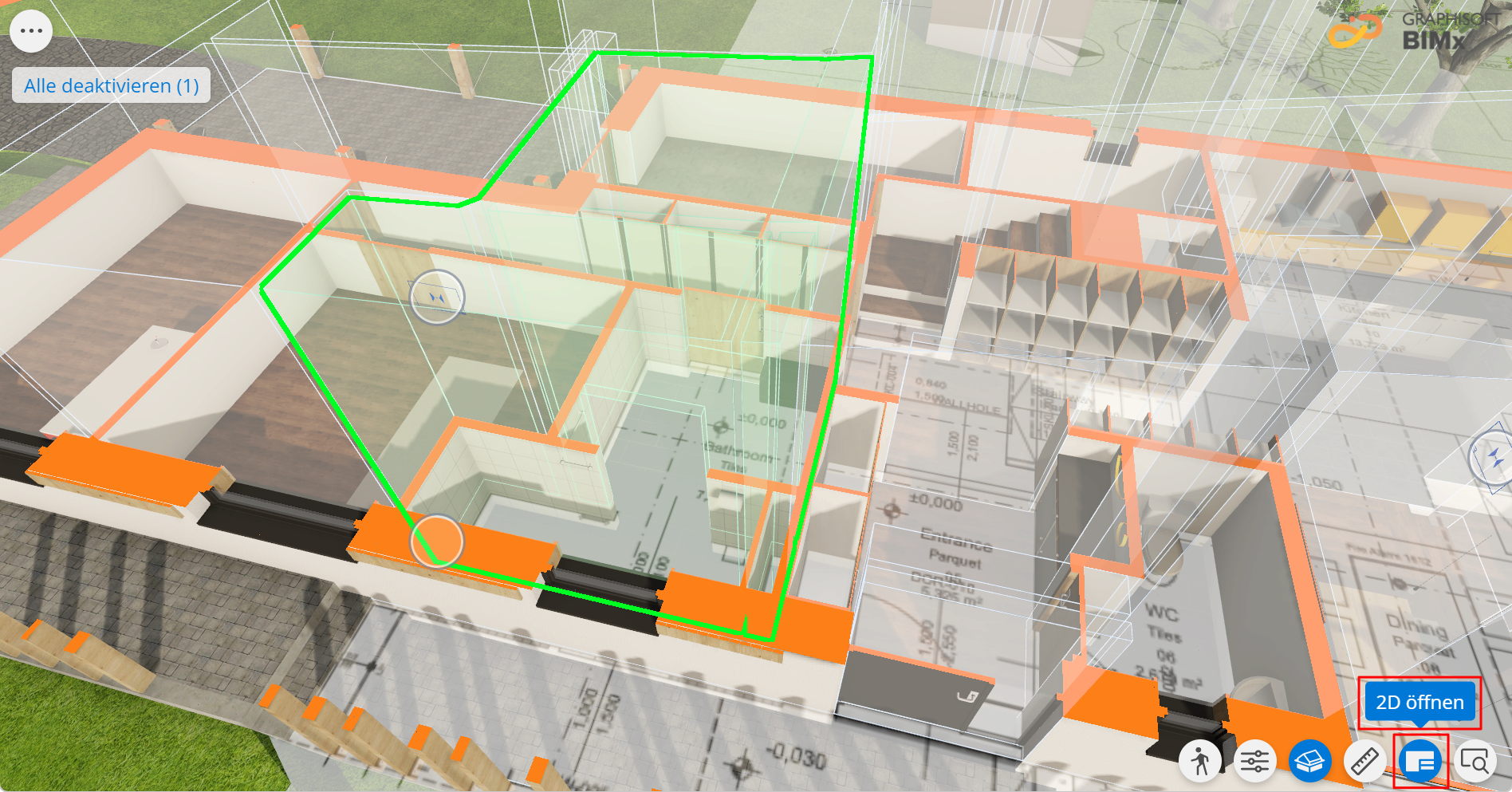 Um die Anzeige einer Raumfläche von 3D auf 2D umzuschalten, klicken Sie im Menü unten rechts auf den Befehl In 2D öffnen.