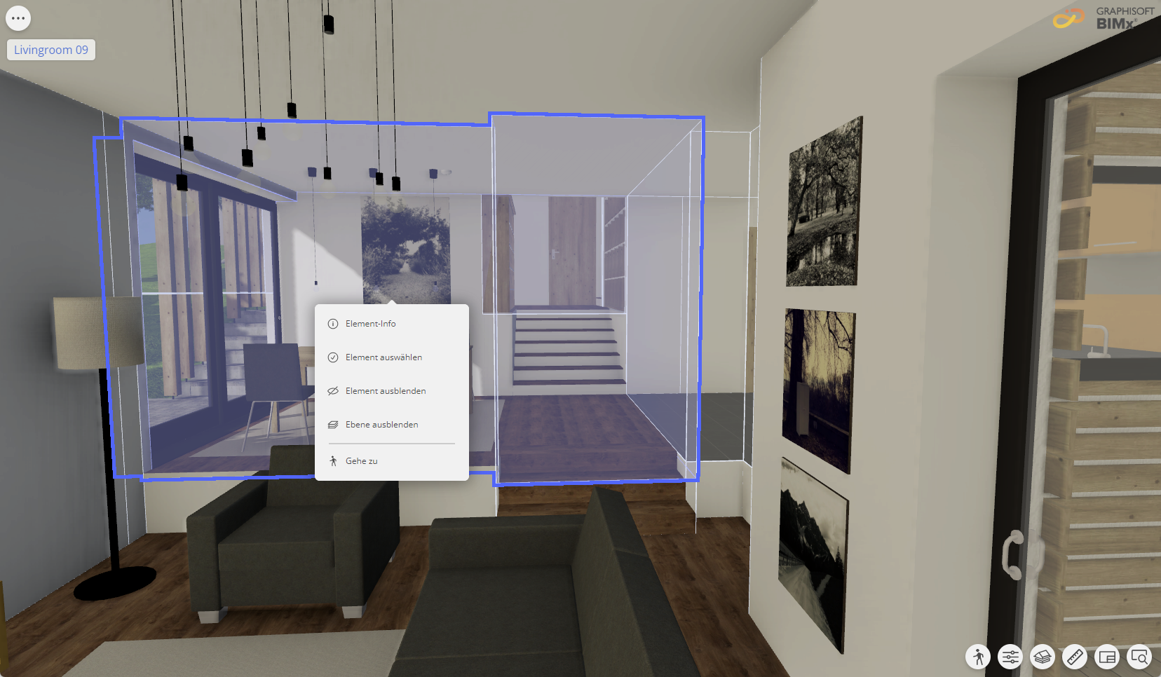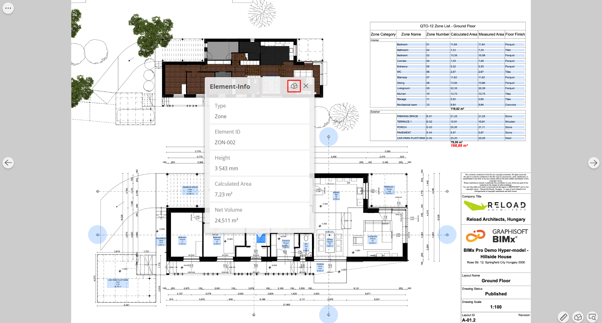- Klicken Sie auf das Haussymbol in der oberen rechten Ecke der Elementinfo, um die Raumfläche in 3D zu öffnen und auszuwählen.