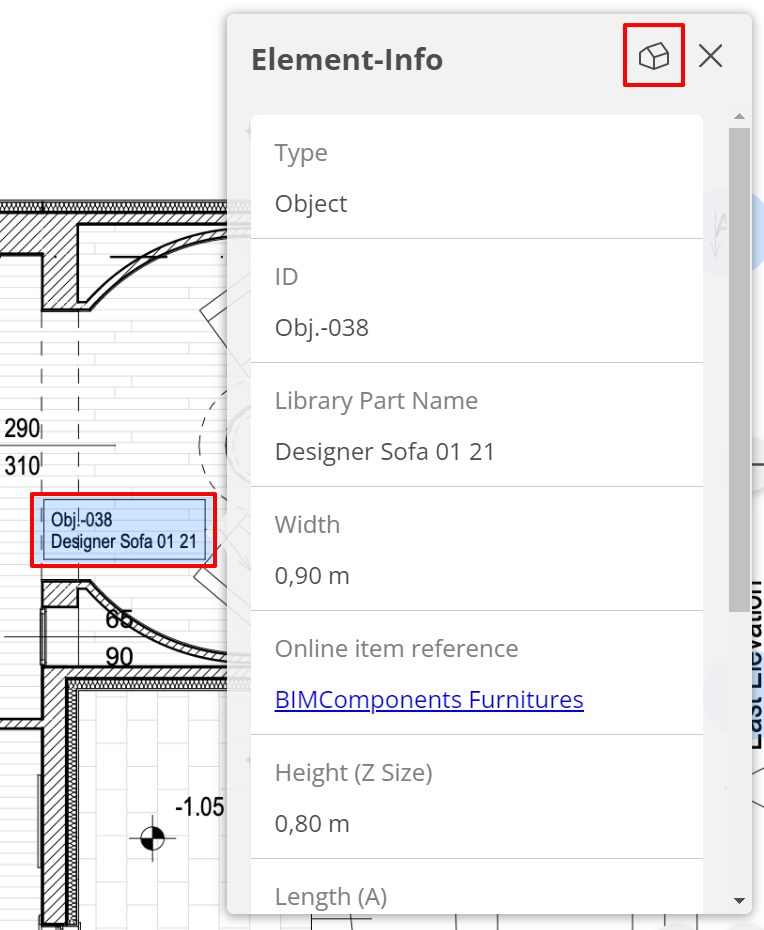 Klicken Sie auf ein Etikett, um auf BIM-Elementdaten aus dem Layout zuzugreifen